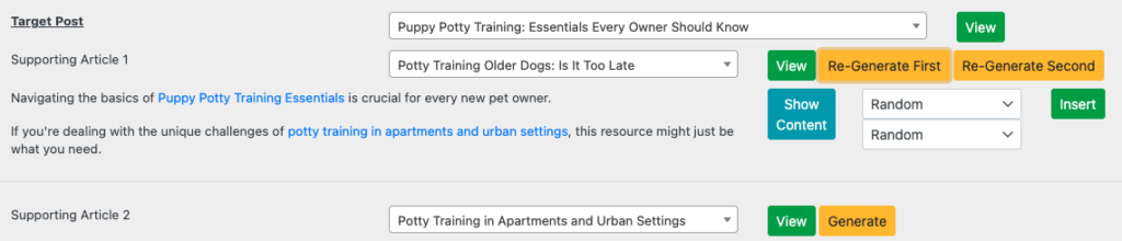 There will be 2 drop downs that say Random. The top drop-down will correspond to the link that goes to the Target Post. The bottom drop-down will correspond to the link that goes to the Supporting Article.
