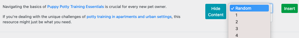 A drop-down box will say Random. The other options in the drop-down are a bunch of numbers. They are the paragraph number on the page that you putting the links on. If you click “Show Content”, it will pop down and show you each paragraph on the page. You can select the paragraph number that you want a link added to or you can just have the AI randomly pick a paragraph by keeping the drop down on Random.