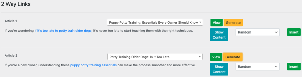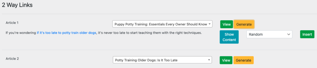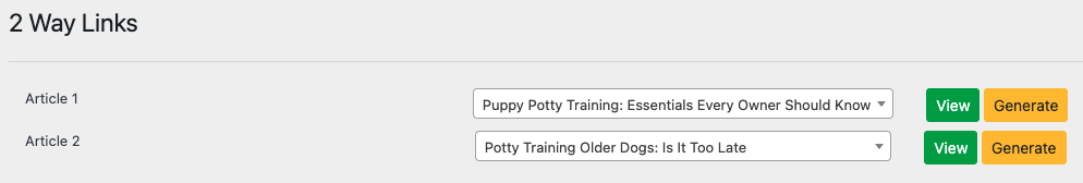 Simply select from a drop-down the two articles that you want to link internally to each other.